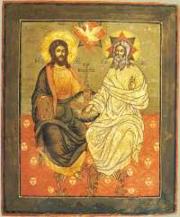 Наиболее древним, но не ранее начала XV в. считается вариант "Новозаветной Троицы", получивший название "Отечество", где изображены сидящий на престоле старец и у него на коленях (в лоне) - отрок, держащий медальон или сферу с вылетающим из нее голубем.